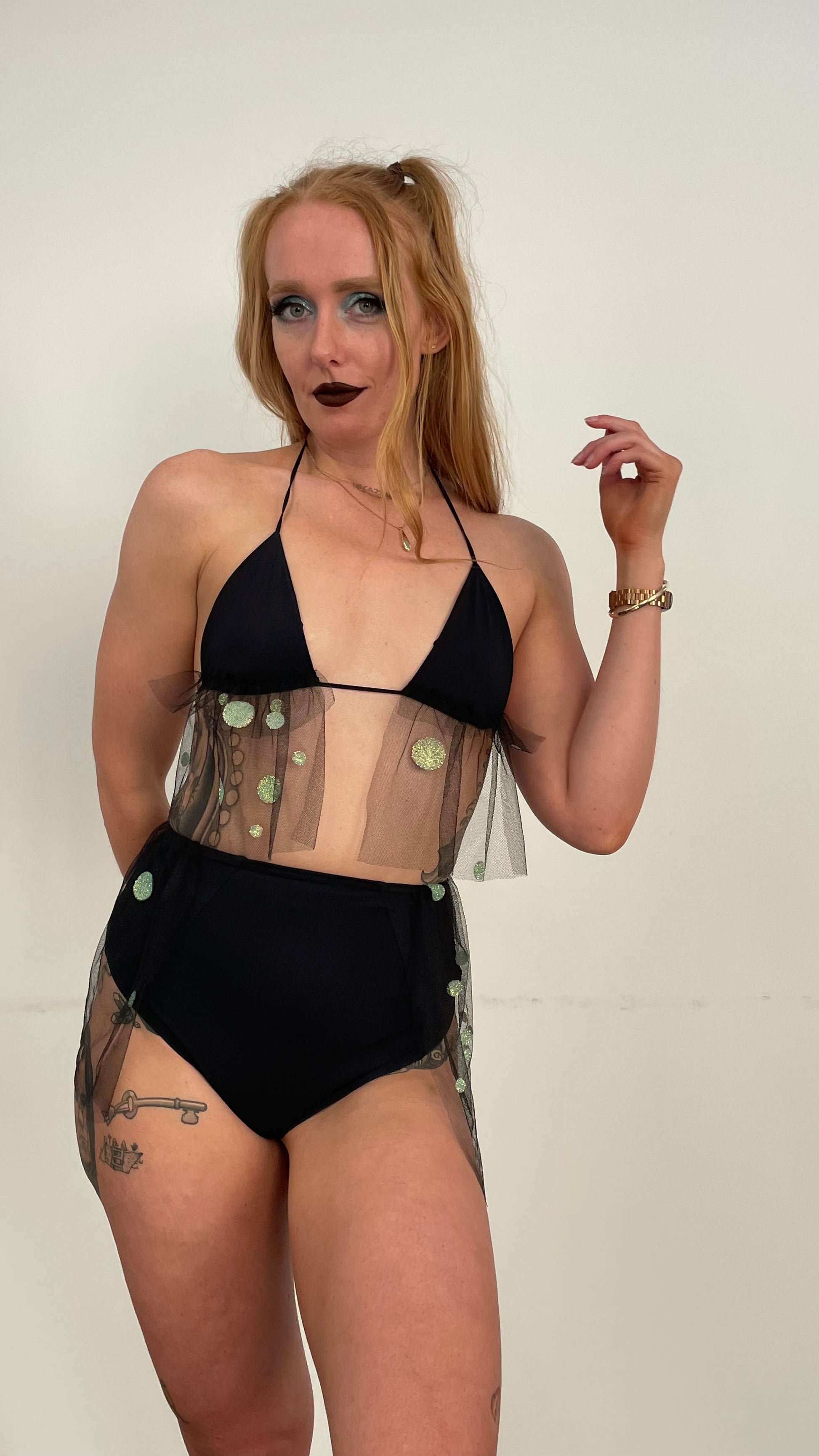 A bikini top + high waisted thong with glitter polka dot gathered detailing