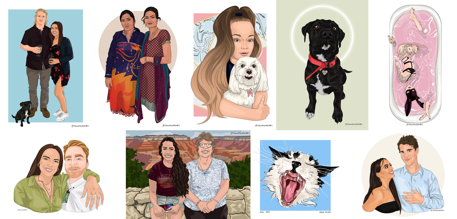 Contact us with a photo you'd like recreated. As well as any reference photos of clothing, jewellery, makeup or hairstyles you'd like in the final illustration. We can mix and match photos together as well, see below for an example!