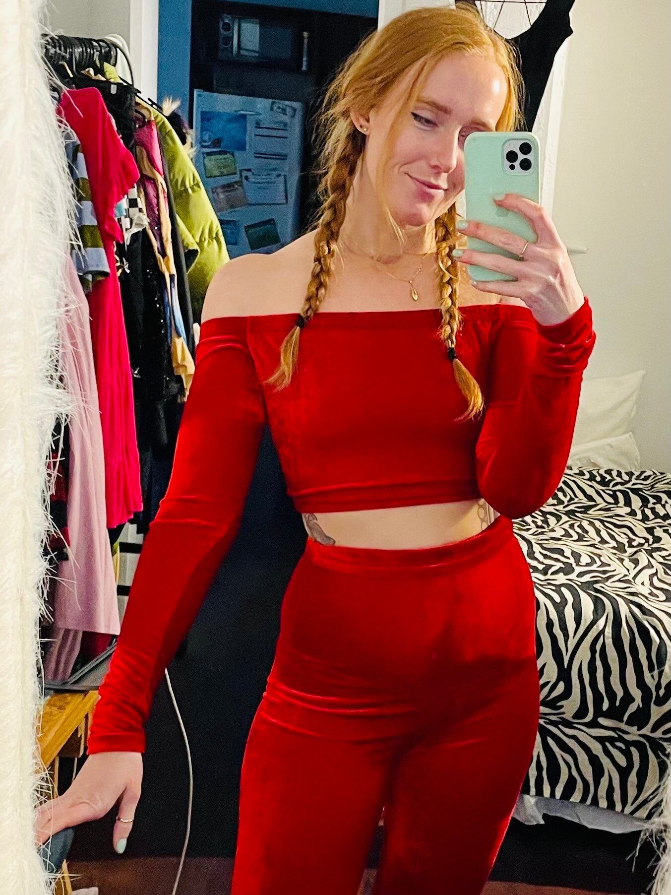 Off the shoulder. Long sleeves. Crop length. What else could you want in a top?? So cute and comfy to boot! Can be made in any spandex, velvet or stretch mesh.